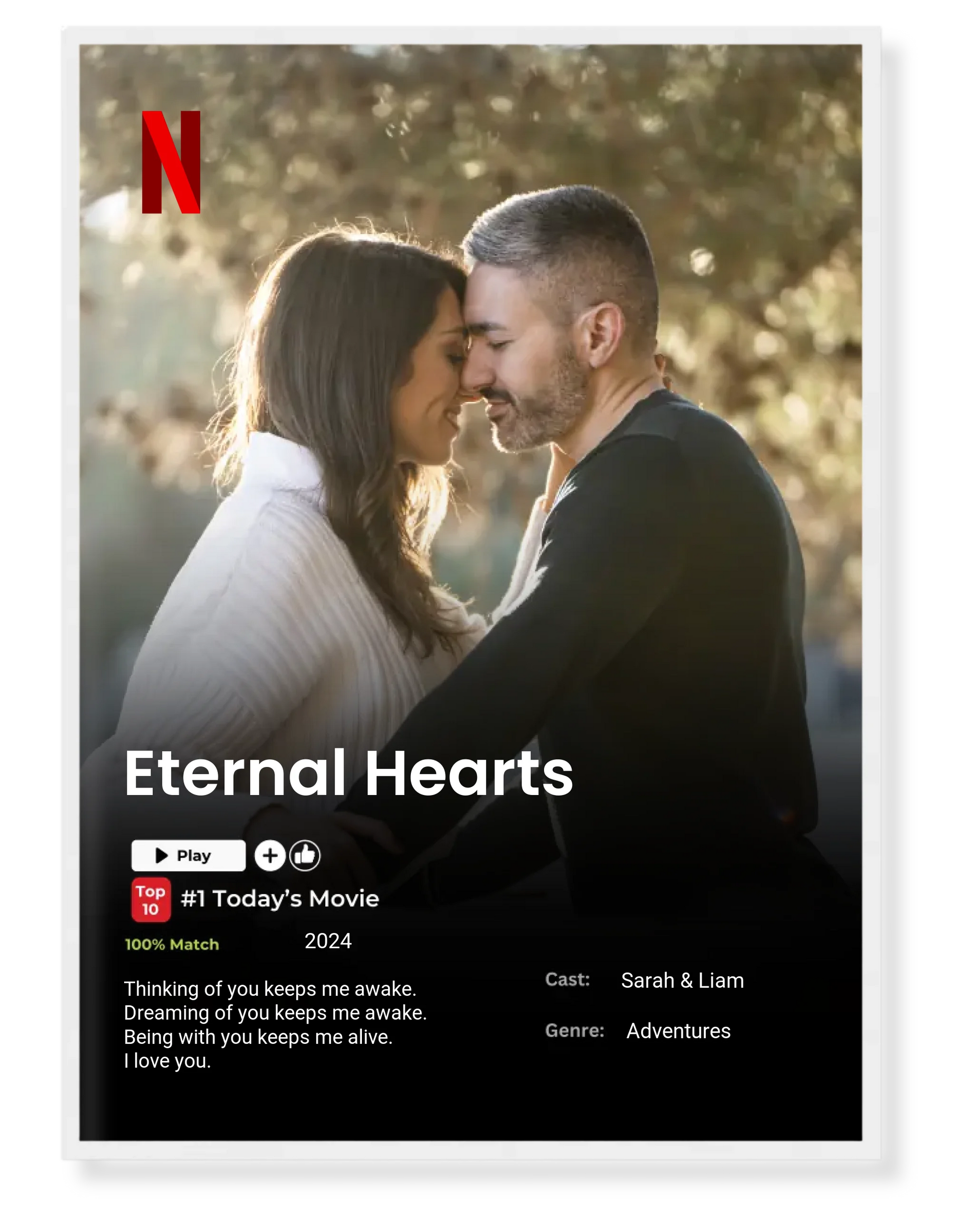 Ever dreamed of seeing your name in lights? Now’s your chance! With our Personalized Netflix-Style Poster, you and your loved ones become the stars of your very own hit movie or TV show. Simply upload your photo, choose a title, and add custom details like cast names, a special date, or a personal message, and we’ll transform it into an epic, cinema-worthy masterpiece!