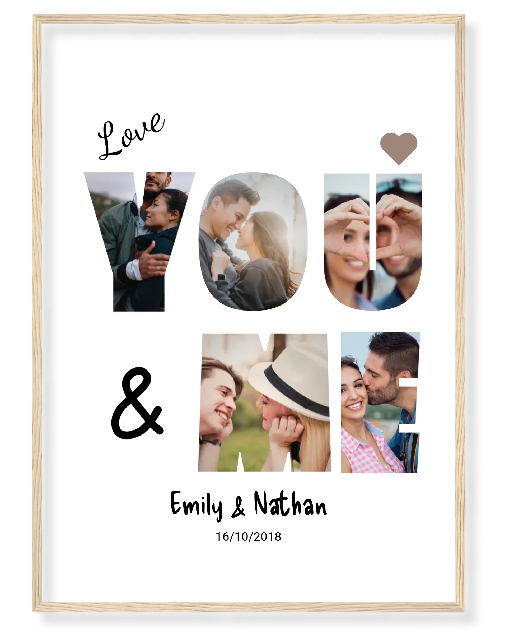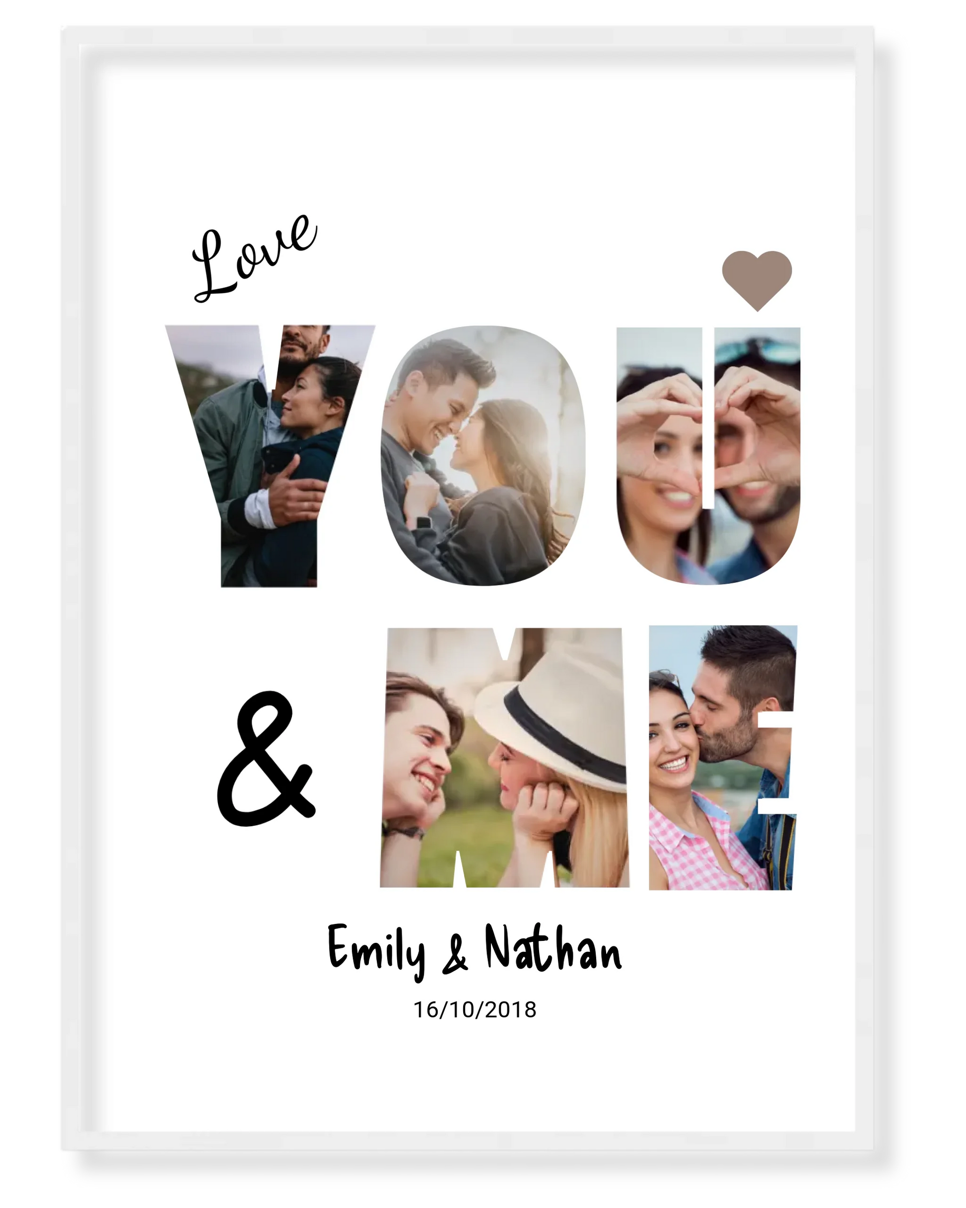Celebrate your love with a one-of-a-kind "YOU & ME" Photo Collage, a stunning piece of personalized wall art designed to showcase your most treasured moments together. This beautifully crafted collage transforms your favorite photos into the shape of the words YOU & ME, creating a heartfelt and unique tribute to your special bond.